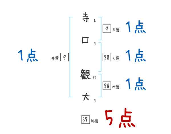 天運![]() | 寺口観大さんの天運は9画の1つ星!消極的で才能を発揮することが苦手なことも。周りの意見に耳を傾けましょう。 家系が持つ宿命的な運勢を表します。祖先から受け継いだ苗字ですので自分の力が及びません。家柄を象徴します。 |