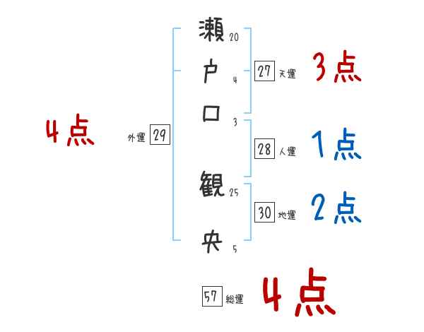 総運![]() | 瀬戸口観央さんの総運は57画の4つ星!向上心があり人望がある。地位を得る。 あなたの人生を表す1番重要な運勢です。生涯を通じて影響する総合運となり、主に50歳以降の晩年期に影響を及ぼします。 |