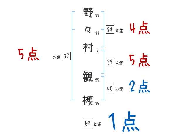 人運![]() | 野々村観槻さんの人運は32画の5つ星!柔軟性があり成功する。チャンスが多く金運が良い。 性格や才能などを表す2番目に重要な運勢です。人間関係や協調性、社会的な成功に影響します。主に20歳から50歳ぐらいまでの中年期の運勢を表します。 |