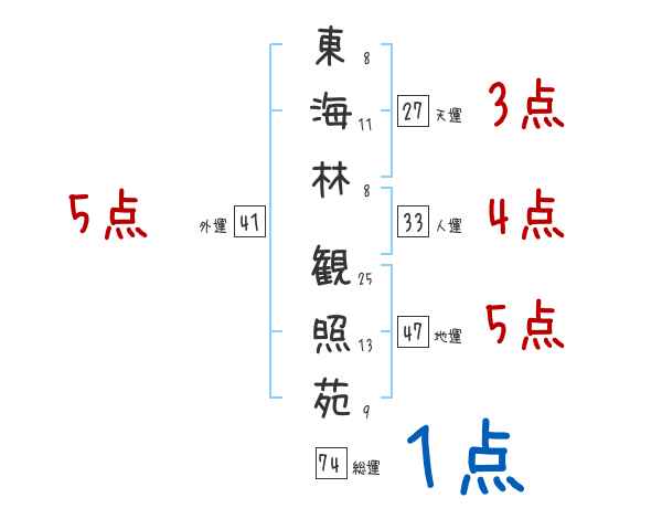 地運![]() | 東海林観照苑さんの地運は47画の5つ星!実力が開花し発展する円満な人生。財に恵まれる。 個性を表す基礎的な運勢です。性格形成や対人関係、行動力など家庭環境に影響されます。主に誕生してから20歳くらいまでの若年期の運勢を表します。 |