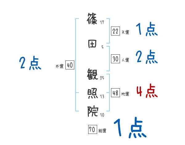天運![]() | 篠田観照院さんの天運は22画の1つ星!努力することが苦手ないっぽう手先が器用。芸術性にも優れる。 家系が持つ宿命的な運勢を表します。祖先から受け継いだ苗字ですので自分の力が及びません。家柄を象徴します。 |