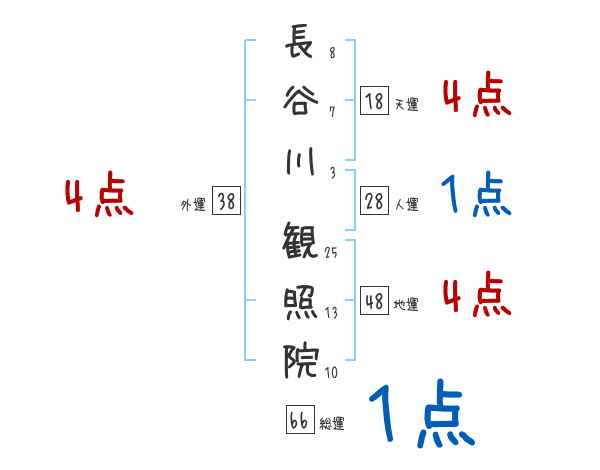 天運![]() | 長谷川観照院さんの天運は18画の4つ星!情熱的で剛気。忍耐力があり信頼される。 家系が持つ宿命的な運勢を表します。祖先から受け継いだ苗字ですので自分の力が及びません。家柄を象徴します。 |