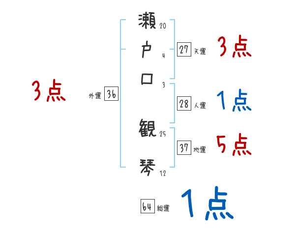 人運![]() | 瀬戸口観琴さんの人運は28画の1つ星!家庭環境に注意。スポーツで活躍できる能力があるかも。 性格や才能などを表す2番目に重要な運勢です。人間関係や協調性、社会的な成功に影響します。主に20歳から50歳ぐらいまでの中年期の運勢を表します。 |