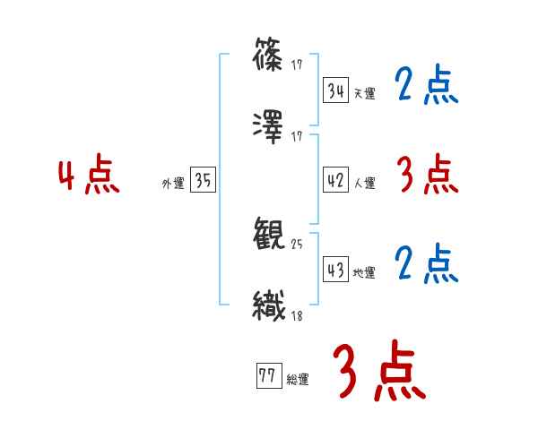 天運![]() | 篠澤観織さんの天運は34画の2つ星!独創性に優れるが、自尊心が強く災難に注意しましょう。 家系が持つ宿命的な運勢を表します。祖先から受け継いだ苗字ですので自分の力が及びません。家柄を象徴します。 |