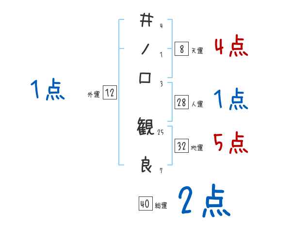 人運![]() | 井ノ口観良さんの人運は28画の1つ星!家庭環境に注意。スポーツで活躍できる能力があるかも。 性格や才能などを表す2番目に重要な運勢です。人間関係や協調性、社会的な成功に影響します。主に20歳から50歳ぐらいまでの中年期の運勢を表します。 |