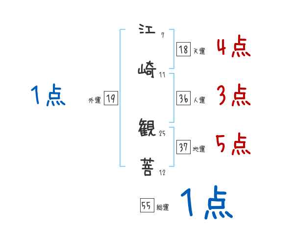 人運![]() | 江崎観菩さんの人運は36画の3つ星!先見性が豊かです。多少神経質で苦労することも。 性格や才能などを表す2番目に重要な運勢です。人間関係や協調性、社会的な成功に影響します。主に20歳から50歳ぐらいまでの中年期の運勢を表します。 |