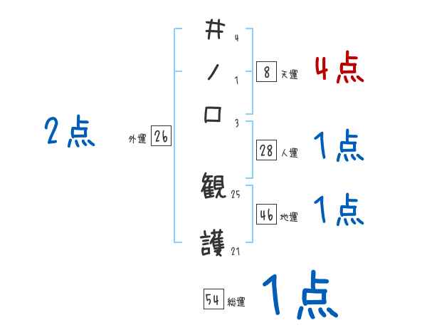 外運![]() | 井ノ口観護さんの外運は26画の2つ星!波瀾万丈かも。信頼できる人を大事にしましょう。 生活面を象徴する運勢です。外部から受ける影響力を表し、結婚運、家庭運や職場、環境への順応性を表します。 |