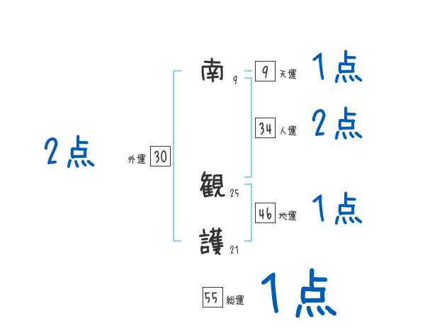 天運![]() | 南観護さんの天運は9画の1つ星!消極的で才能を発揮することが苦手なことも。周りの意見に耳を傾けましょう。 家系が持つ宿命的な運勢を表します。祖先から受け継いだ苗字ですので自分の力が及びません。家柄を象徴します。 |
