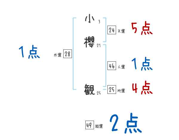 総運![]() | 小櫻観さんの総運は49画の2つ星!不安定な性格で明暗がある人生。周りの人には支援されやすい。 あなたの人生を表す1番重要な運勢です。生涯を通じて影響する総合運となり、主に50歳以降の晩年期に影響を及ぼします。 |