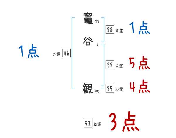 天運![]() | 竈谷観さんの天運は28画の1つ星!家庭環境に注意。スポーツで活躍できる能力があるかも。 家系が持つ宿命的な運勢を表します。祖先から受け継いだ苗字ですので自分の力が及びません。家柄を象徴します。 |
