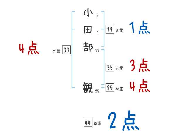 総運![]() | 小田部観さんの総運は44画の2つ星!誠実で慎重な性格。物事を考えすぎないように注意しましょう。 あなたの人生を表す1番重要な運勢です。生涯を通じて影響する総合運となり、主に50歳以降の晩年期に影響を及ぼします。 |