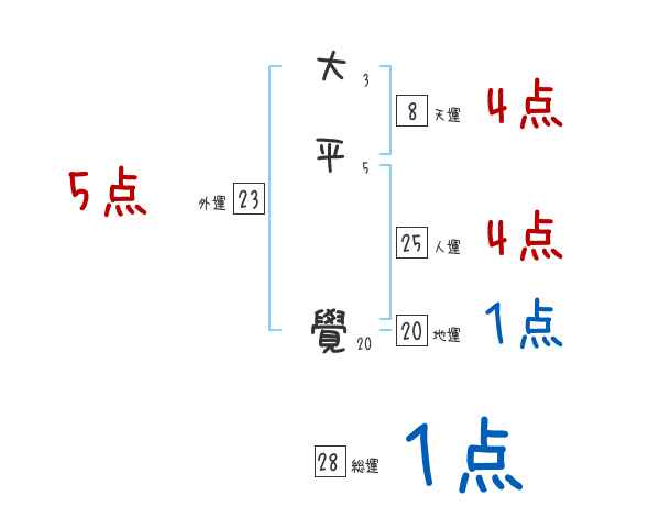 総運![]() | 大平覺さんの総運は28画の1つ星!家庭環境に注意。スポーツで活躍できる能力があるかも。 あなたの人生を表す1番重要な運勢です。生涯を通じて影響する総合運となり、主に50歳以降の晩年期に影響を及ぼします。 |