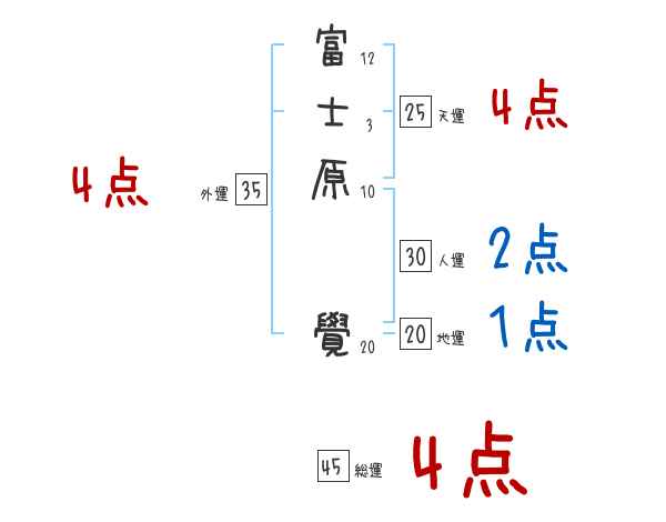 天運![]() | 富士原覺さんの天運は25画の4つ星!個性があり才能があふれる。強運の持ち主で発展する。 家系が持つ宿命的な運勢を表します。祖先から受け継いだ苗字ですので自分の力が及びません。家柄を象徴します。 |