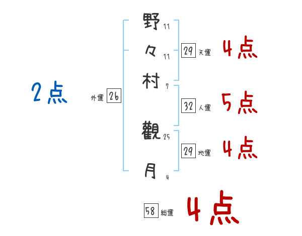 人運![]() | 野々村觀月さんの人運は32画の5つ星!柔軟性があり成功する。チャンスが多く金運が良い。 性格や才能などを表す2番目に重要な運勢です。人間関係や協調性、社会的な成功に影響します。主に20歳から50歳ぐらいまでの中年期の運勢を表します。 |