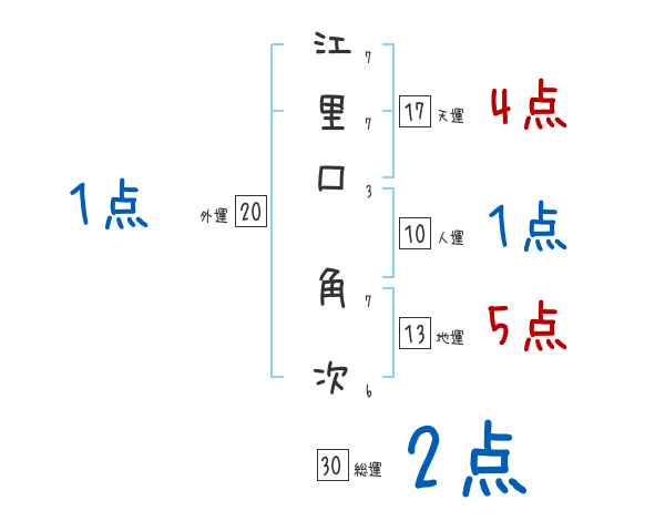 外運![]() | 江里口角次さんの外運は20画の1つ星!社交が苦手。人とは違った才能があり波乱万丈な人生かも。 生活面を象徴する運勢です。外部から受ける影響力を表し、結婚運、家庭運や職場、環境への順応性を表します。 |