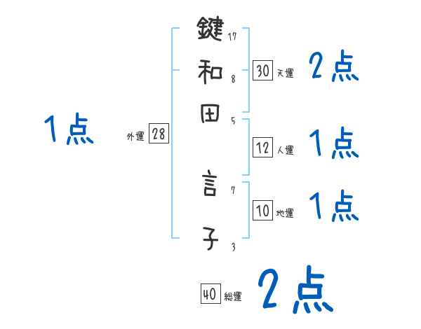 天運![]() | 鍵和田言子さんの天運は30画の2つ星!浮き沈みの激しさに注意しましょう。 家系が持つ宿命的な運勢を表します。祖先から受け継いだ苗字ですので自分の力が及びません。家柄を象徴します。 |
