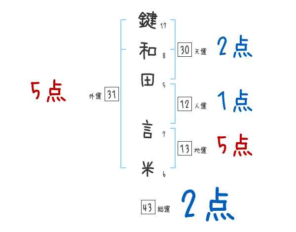 天運![]() | 鍵和田言米さんの天運は30画の2つ星!浮き沈みの激しさに注意しましょう。 家系が持つ宿命的な運勢を表します。祖先から受け継いだ苗字ですので自分の力が及びません。家柄を象徴します。 |