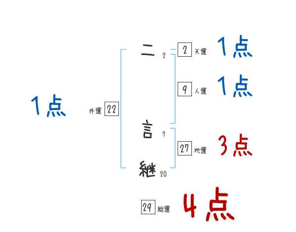 外運![]() | 二言継さんの外運は22画の1つ星!努力することが苦手ないっぽう手先が器用。芸術性にも優れる。 生活面を象徴する運勢です。外部から受ける影響力を表し、結婚運、家庭運や職場、環境への順応性を表します。 |