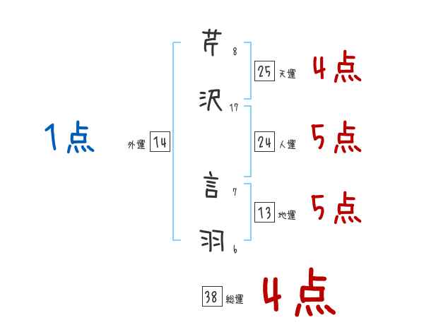 天運![]() | 芹沢言羽さんの天運は25画の4つ星!個性があり才能があふれる。強運の持ち主で発展する。 家系が持つ宿命的な運勢を表します。祖先から受け継いだ苗字ですので自分の力が及びません。家柄を象徴します。 |