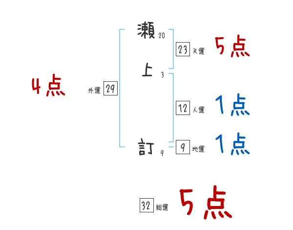 総運![]() | 瀬上訂さんの総運は32画の5つ星!柔軟性があり成功する。チャンスが多く金運が良い。 あなたの人生を表す1番重要な運勢です。生涯を通じて影響する総合運となり、主に50歳以降の晩年期に影響を及ぼします。 |