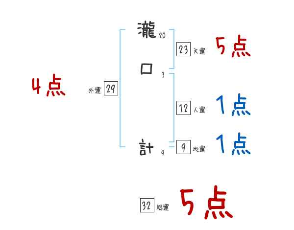 天運![]() | 瀧口計さんの天運は23画の5つ星!想像力に優れ活力がある。一代で成功し名誉を手に入れる。 家系が持つ宿命的な運勢を表します。祖先から受け継いだ苗字ですので自分の力が及びません。家柄を象徴します。 |