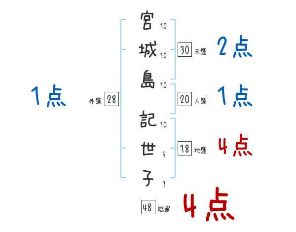 天運![]() | 宮城島記世子さんの天運は30画の2つ星!浮き沈みの激しさに注意しましょう。 家系が持つ宿命的な運勢を表します。祖先から受け継いだ苗字ですので自分の力が及びません。家柄を象徴します。 |