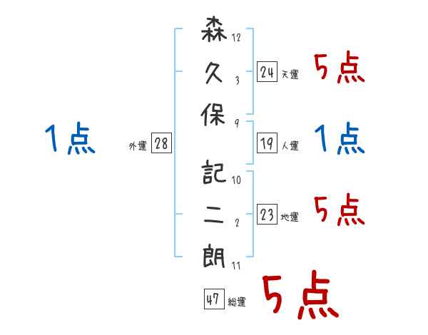 総運![]() | 森久保記二朗さんの総運は47画の5つ星!実力が開花し発展する円満な人生。財に恵まれる。 あなたの人生を表す1番重要な運勢です。生涯を通じて影響する総合運となり、主に50歳以降の晩年期に影響を及ぼします。 |
