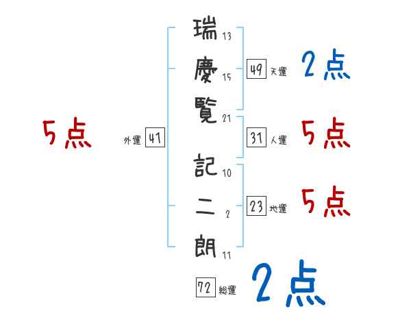 天運![]() | 瑞慶覧記二朗さんの天運は49画の2つ星!不安定な性格で明暗がある人生。周りの人には支援されやすい。 家系が持つ宿命的な運勢を表します。祖先から受け継いだ苗字ですので自分の力が及びません。家柄を象徴します。 |