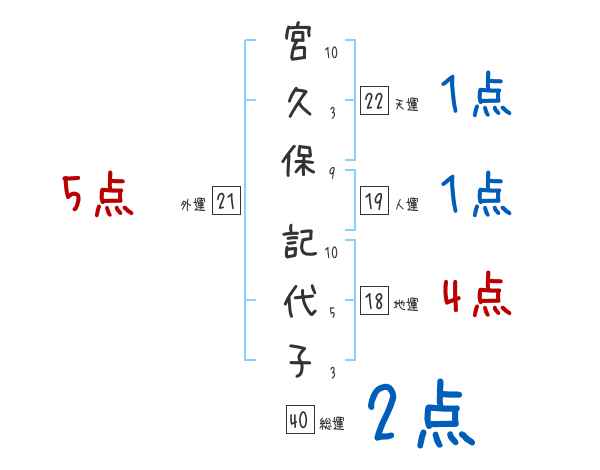 外運![]() | 宮久保記代子さんの外運は21画の5つ星!統率力がある。独立し成功する。名誉を手に入れる。 生活面を象徴する運勢です。外部から受ける影響力を表し、結婚運、家庭運や職場、環境への順応性を表します。 |