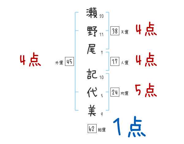 外運![]() | 瀬野尾記代美さんの外運は45画の4つ星!もくもくと物事を進め達成する。地味な努力家。 生活面を象徴する運勢です。外部から受ける影響力を表し、結婚運、家庭運や職場、環境への順応性を表します。 |