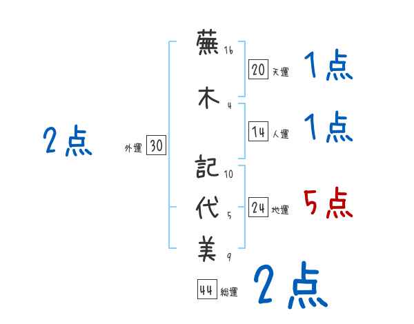 総運![]() | 蕪木記代美さんの総運は44画の2つ星!誠実で慎重な性格。物事を考えすぎないように注意しましょう。 あなたの人生を表す1番重要な運勢です。生涯を通じて影響する総合運となり、主に50歳以降の晩年期に影響を及ぼします。 |