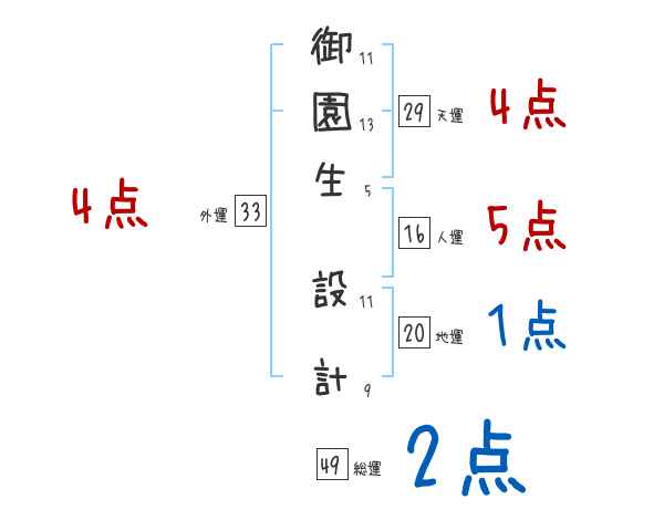 総運![]() | 御園生設計さんの総運は49画の2つ星!不安定な性格で明暗がある人生。周りの人には支援されやすい。 あなたの人生を表す1番重要な運勢です。生涯を通じて影響する総合運となり、主に50歳以降の晩年期に影響を及ぼします。 |