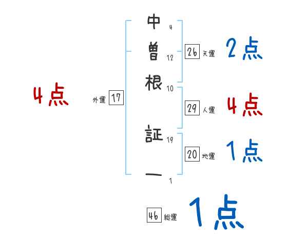 外運![]()  | 中曽根証一さんの外運は17画の4つ星!積極的な行動力。地位を気づき財産を手に入れる。純粋な心と直感力。 生活面を象徴する運勢です。外部から受ける影響力を表し、結婚運、家庭運や職場、環境への順応性を表します。 |