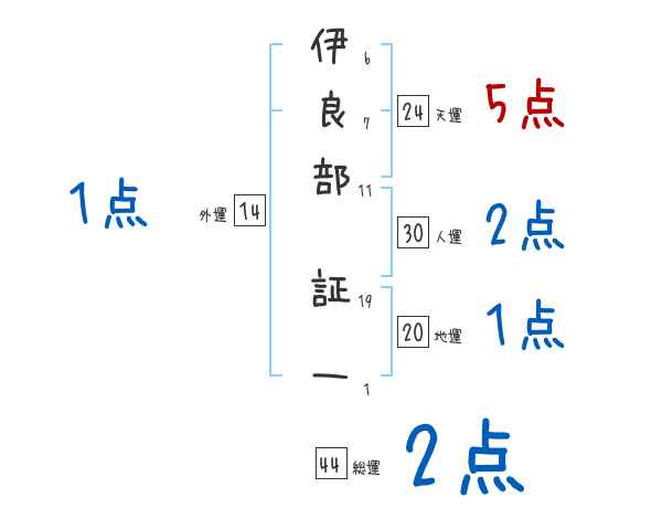 外運![]() | 伊良部証一さんの外運は14画の1つ星!人に対して優しいがストレスを溜め込みがち。人間関係のトラブルを避けるよう気をつけましょう。 生活面を象徴する運勢です。外部から受ける影響力を表し、結婚運、家庭運や職場、環境への順応性を表します。 |