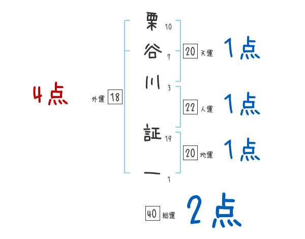 人運![]() | 栗谷川証一さんの人運は22画の1つ星!努力することが苦手ないっぽう手先が器用。芸術性にも優れる。 性格や才能などを表す2番目に重要な運勢です。人間関係や協調性、社会的な成功に影響します。主に20歳から50歳ぐらいまでの中年期の運勢を表します。 |