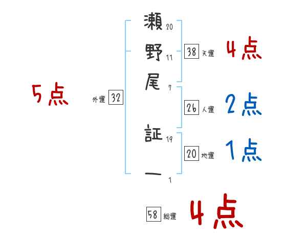 外運![]() | 瀬野尾証一さんの外運は32画の5つ星!柔軟性があり成功する。チャンスが多く金運が良い。 生活面を象徴する運勢です。外部から受ける影響力を表し、結婚運、家庭運や職場、環境への順応性を表します。 |