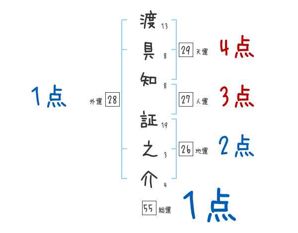 渡具知証之介さんの画数の鑑定結果