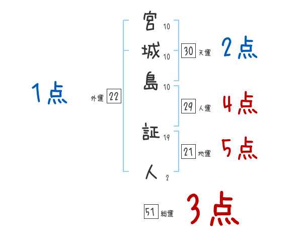 人運![]() | 宮城島証人さんの人運は29画の4つ星!完全主義で才能がある。厳格な心の持ち主。 性格や才能などを表す2番目に重要な運勢です。人間関係や協調性、社会的な成功に影響します。主に20歳から50歳ぐらいまでの中年期の運勢を表します。 |