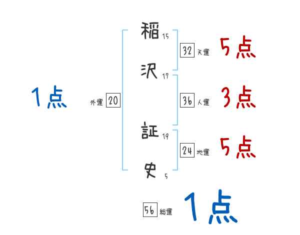 天運![]() | 稲沢証史さんの天運は32画の5つ星!柔軟性があり成功する。チャンスが多く金運が良い。 家系が持つ宿命的な運勢を表します。祖先から受け継いだ苗字ですので自分の力が及びません。家柄を象徴します。 |
