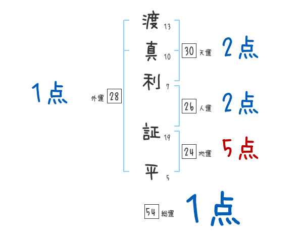 天運![]() | 渡真利証平さんの天運は30画の2つ星!浮き沈みの激しさに注意しましょう。 家系が持つ宿命的な運勢を表します。祖先から受け継いだ苗字ですので自分の力が及びません。家柄を象徴します。 |