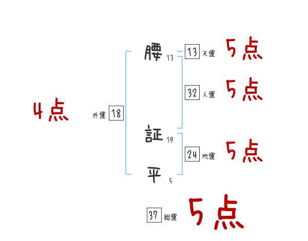 人運![]() | 腰証平さんの人運は32画の5つ星!柔軟性があり成功する。チャンスが多く金運が良い。 性格や才能などを表す2番目に重要な運勢です。人間関係や協調性、社会的な成功に影響します。主に20歳から50歳ぐらいまでの中年期の運勢を表します。 |
