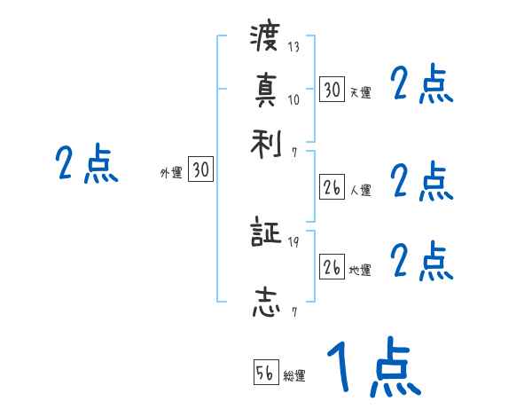 天運![]() | 渡真利証志さんの天運は30画の2つ星!浮き沈みの激しさに注意しましょう。 家系が持つ宿命的な運勢を表します。祖先から受け継いだ苗字ですので自分の力が及びません。家柄を象徴します。 |