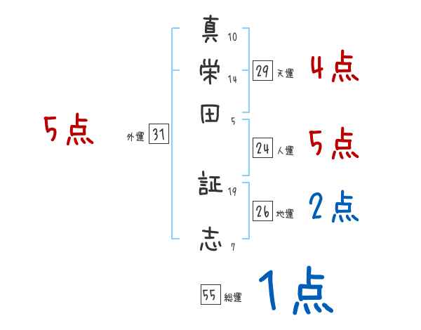 人運![]() | 真栄田証志さんの人運は24画の5つ星!家庭運が良く順調な人生。金運にも恵まれる。 性格や才能などを表す2番目に重要な運勢です。人間関係や協調性、社会的な成功に影響します。主に20歳から50歳ぐらいまでの中年期の運勢を表します。 |