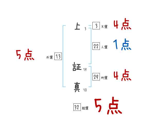 総運![]() | 上証真さんの総運は32画の5つ星!柔軟性があり成功する。チャンスが多く金運が良い。 あなたの人生を表す1番重要な運勢です。生涯を通じて影響する総合運となり、主に50歳以降の晩年期に影響を及ぼします。 |