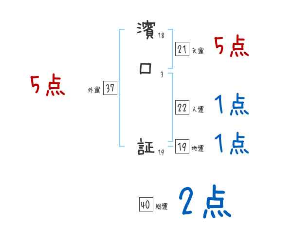 外運![]() | 濱口証さんの外運は37画の5つ星!努力家で順応性に優れる。現実的な考え方ができ忠実に物事をこなす。 生活面を象徴する運勢です。外部から受ける影響力を表し、結婚運、家庭運や職場、環境への順応性を表します。 |