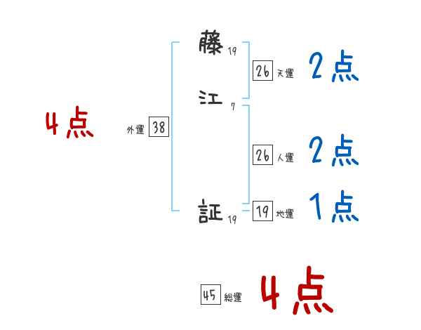 天運![]() | 藤江証さんの天運は26画の2つ星!波瀾万丈かも。信頼できる人を大事にしましょう。 家系が持つ宿命的な運勢を表します。祖先から受け継いだ苗字ですので自分の力が及びません。家柄を象徴します。 |