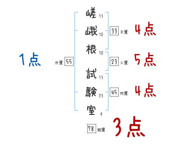天運![]() | 嵯峨根試験室さんの天運は33画の4つ星!権力志向でプライドが高い。勇気があり運を切り開き成功する。 家系が持つ宿命的な運勢を表します。祖先から受け継いだ苗字ですので自分の力が及びません。家柄を象徴します。 |