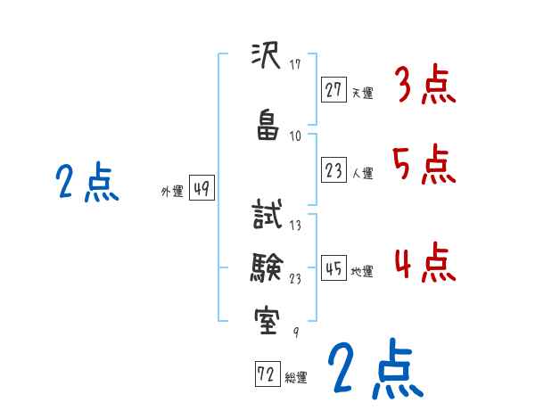 総運![]() | 沢畠試験室さんの総運は72画の2つ星!災難が多く不安定な生活にならないように注意。明暗のある人生かも。 あなたの人生を表す1番重要な運勢です。生涯を通じて影響する総合運となり、主に50歳以降の晩年期に影響を及ぼします。 |