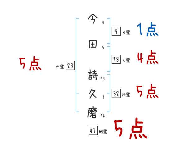 外運![]() | 今田詩久磨さんの外運は23画の5つ星!想像力に優れ活力がある。一代で成功し名誉を手に入れる。 生活面を象徴する運勢です。外部から受ける影響力を表し、結婚運、家庭運や職場、環境への順応性を表します。 |