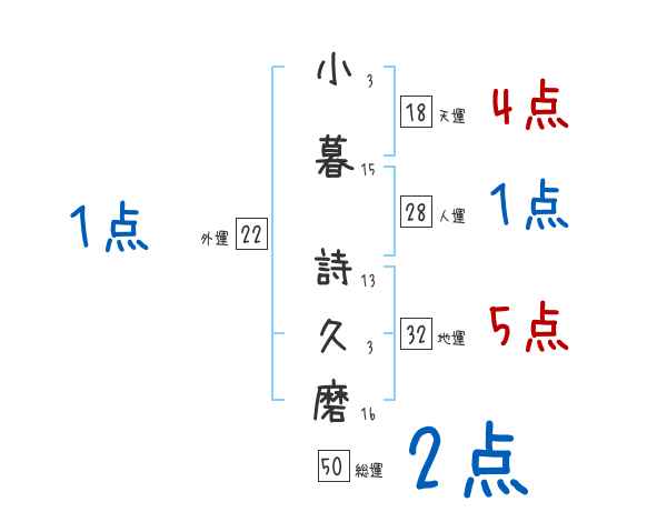 地運![]() | 小暮詩久磨さんの地運は32画の5つ星!柔軟性があり成功する。チャンスが多く金運が良い。 個性を表す基礎的な運勢です。性格形成や対人関係、行動力など家庭環境に影響されます。主に誕生してから20歳くらいまでの若年期の運勢を表します。 |